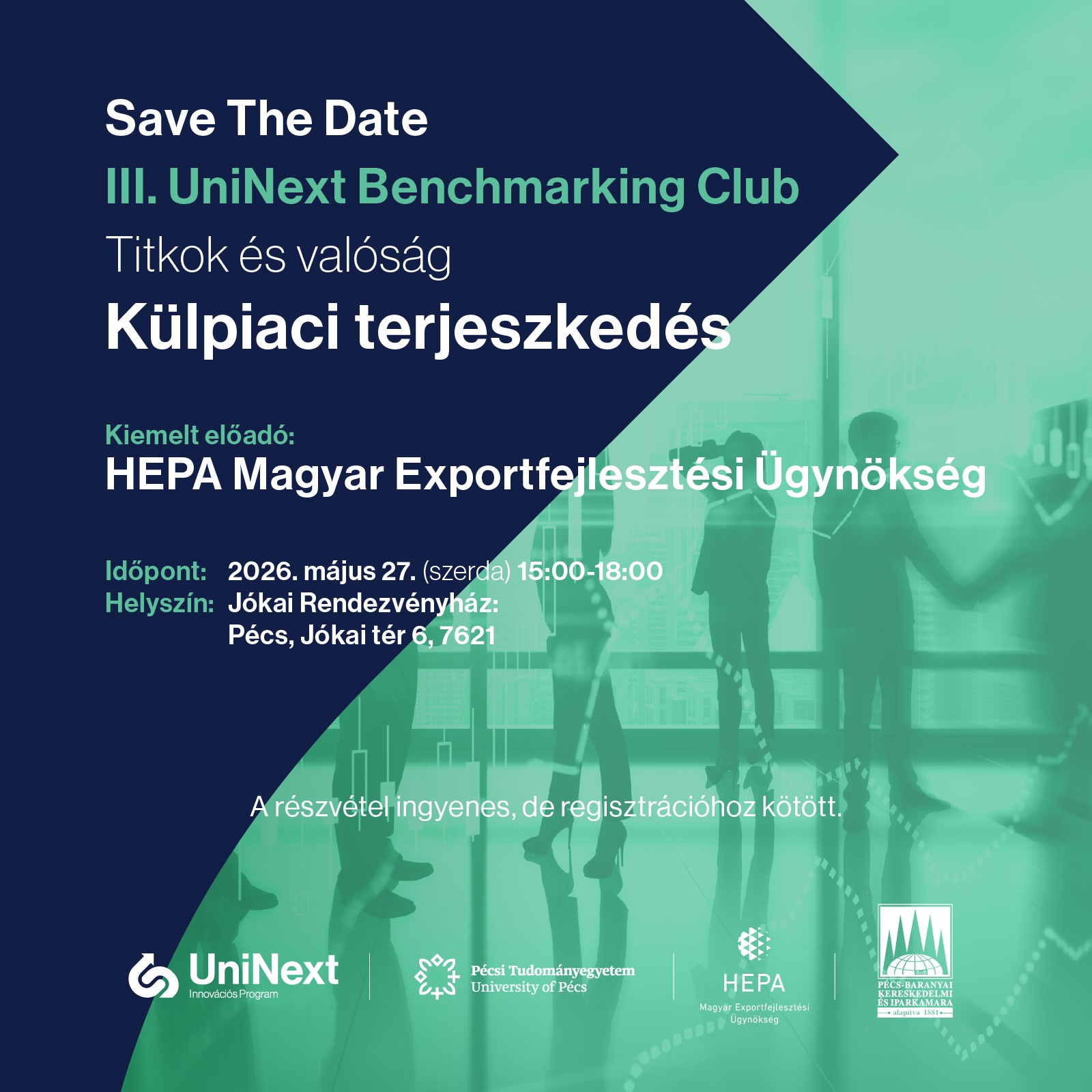 2026. május 27-én, a Pécsi Tudományegyetem szervezésében kerül sor a UniNext Benchmarking Club eseménysorozat harmadik rendezvényére, amelynek során a külpiaci terjeszkedés kerül fókuszba - valós tapasztalatokkal, működő stratégiákkal és őszinte sztorikkal. A rendezvény kiváló alkalmat teremt a kapcsolódásra és tudásmegosztásra, miközben a résztvevő térségi KKV-k átfogó képet kapnak az elérhető programokról, szolgáltatásokról és képzésekről, amelyek segíthetik őket a nemzetközi piacra való nyitásban.